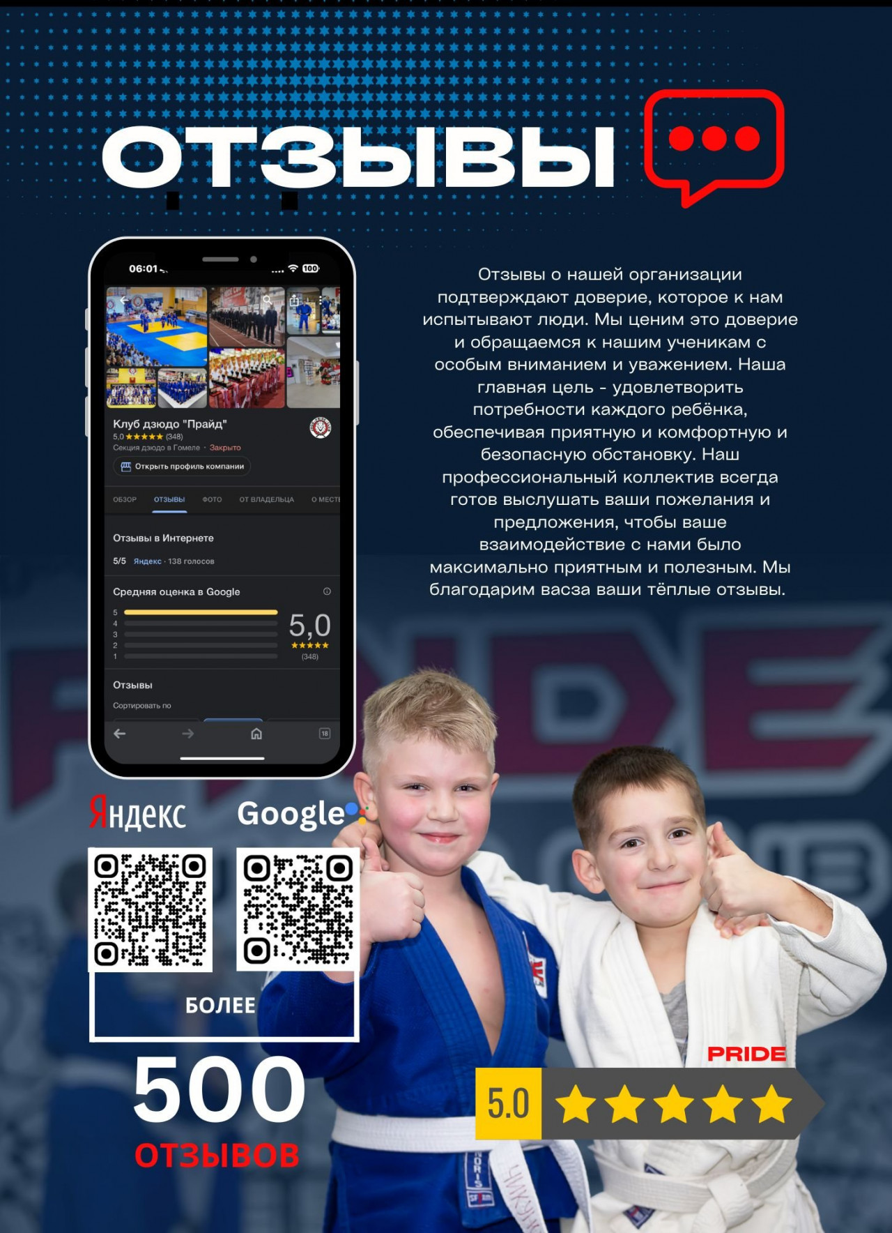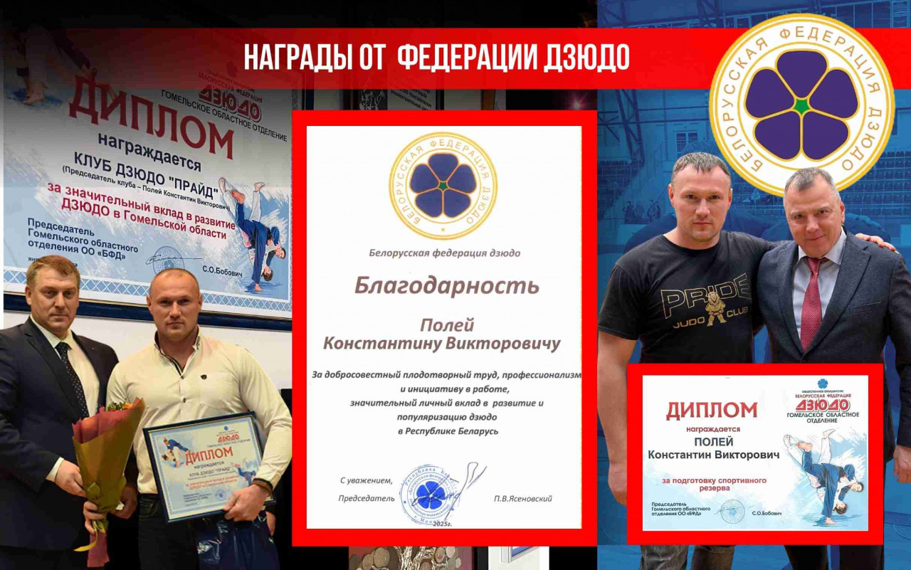 Клуб дзюдо "ПРАЙД" удостоен благодарности от Белорусской федерации дзюдо за добросовестный плодотворный труд, профессионализм и инициативу в работе, значительный личный вклад в развитие и популяризацию дзюдо в Республике Беларусь. Преданность делу открывают молодым спортсменам дорогу в мир дзюдо, где они демонстрируют высокие результаты.